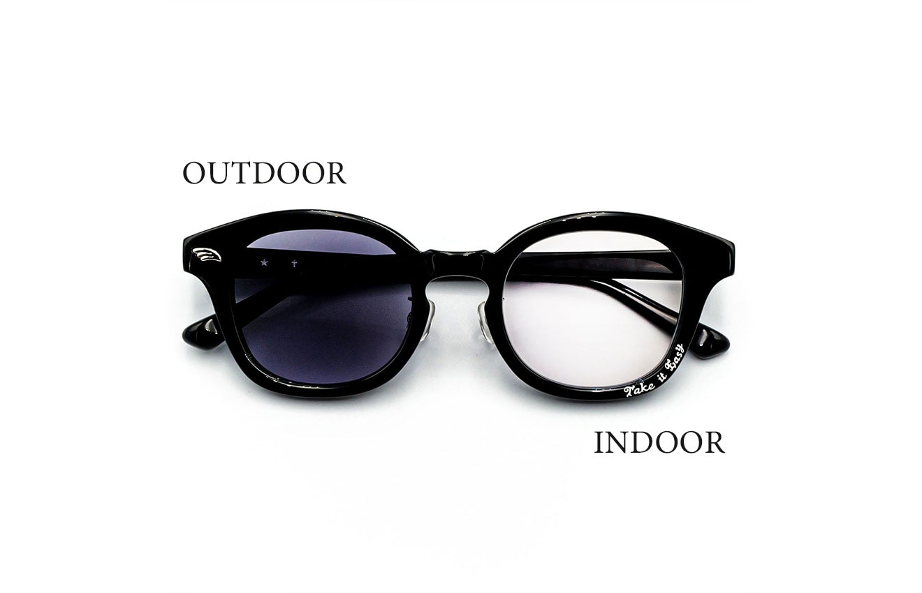 屋外で紫外線を浴びるとレンズカラーが濃くなり、屋内や紫外線が当たらない場所ではクリアレンズに戻るJapan Brand Eyewearとしては珍しい、フラットレンズ仕様の調光レンズ。