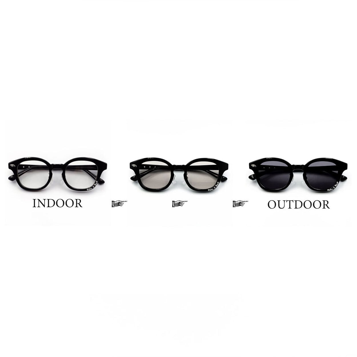 屋外で紫外線を浴びるとレンズカラーが濃くなり、屋内や紫外線が当たらない場所ではクリアレンズに戻るJapan Brand Eyewearとしては稀な、フラットレンズ仕様の調光レンズ。