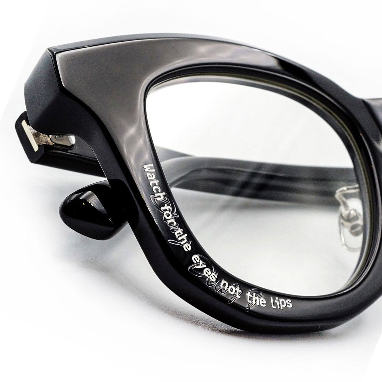 浮かび上がる刻印メッセージがシャープなフラットレンズと呼応し、静かな存在感を際立たせる。
