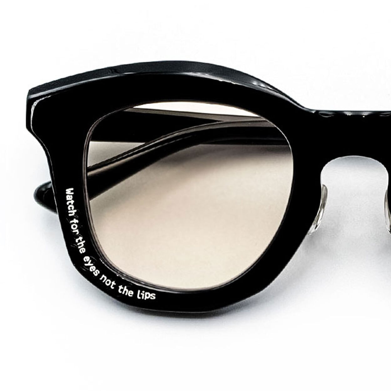 浮かび上がる刻印メッセージがシャープなフラットレンズと呼応し、静かな存在感を際立たせる。