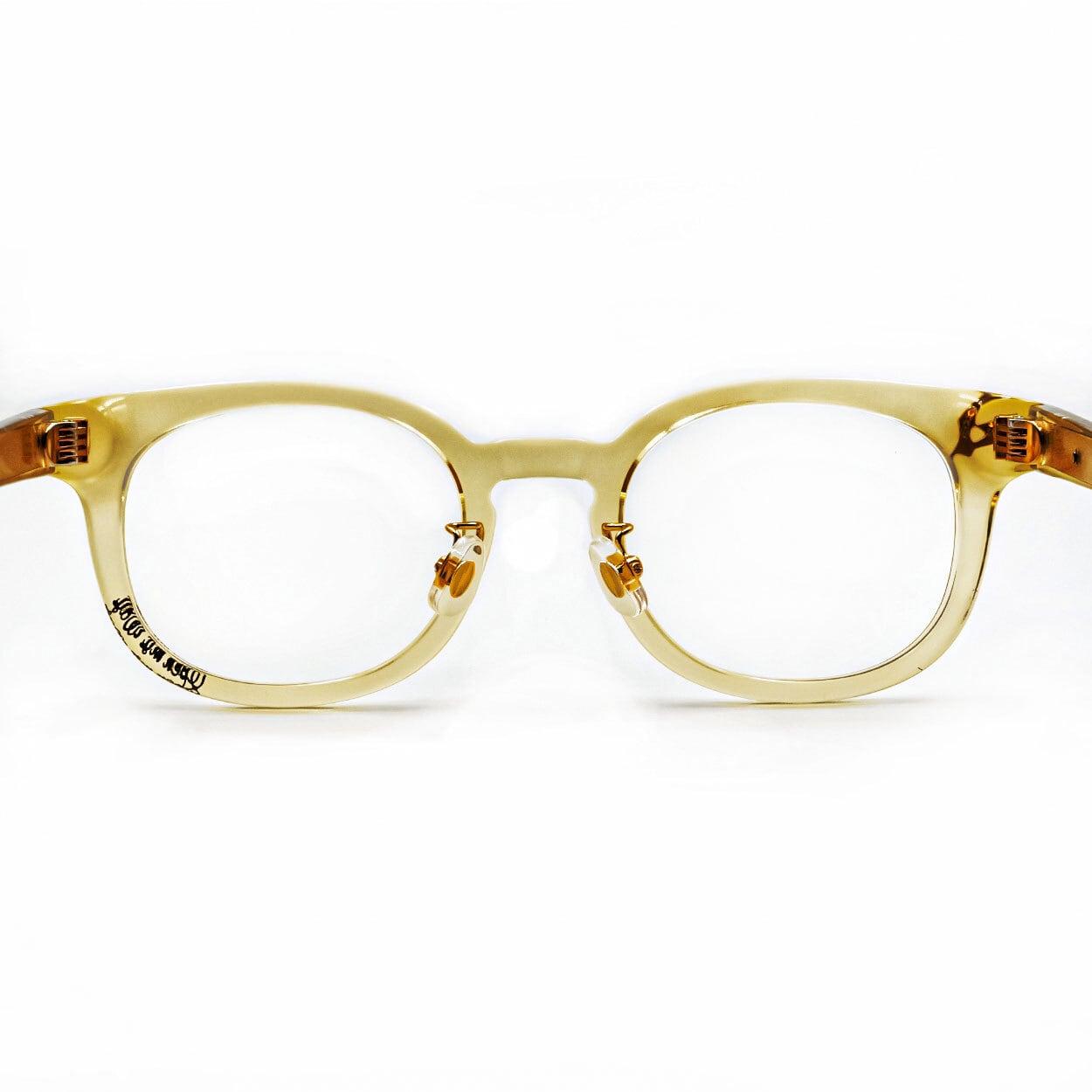 経年を感じさせるVintage Yellowが、光の角度によって静かに表情を変え、淡い透明感の奥に潜ませた深みが、装いに品格を与えるフレーム。